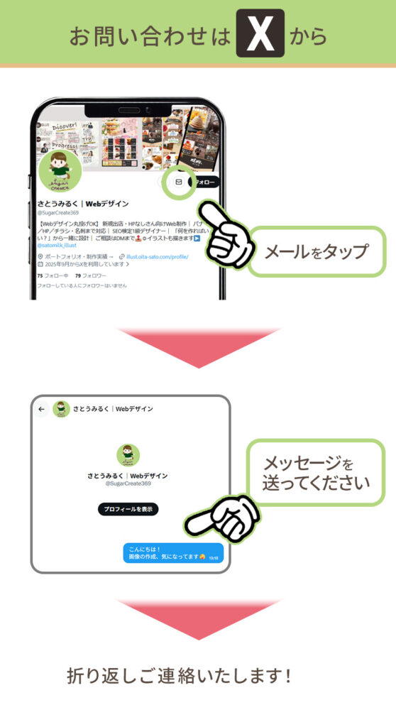 営業時間9:00~18:00ご連絡はXやInstagramなどのDMからでもOK。 イラストXhttps://x.com/satomilk_illust WebデザインXhttps://x.com/SugarCreate369